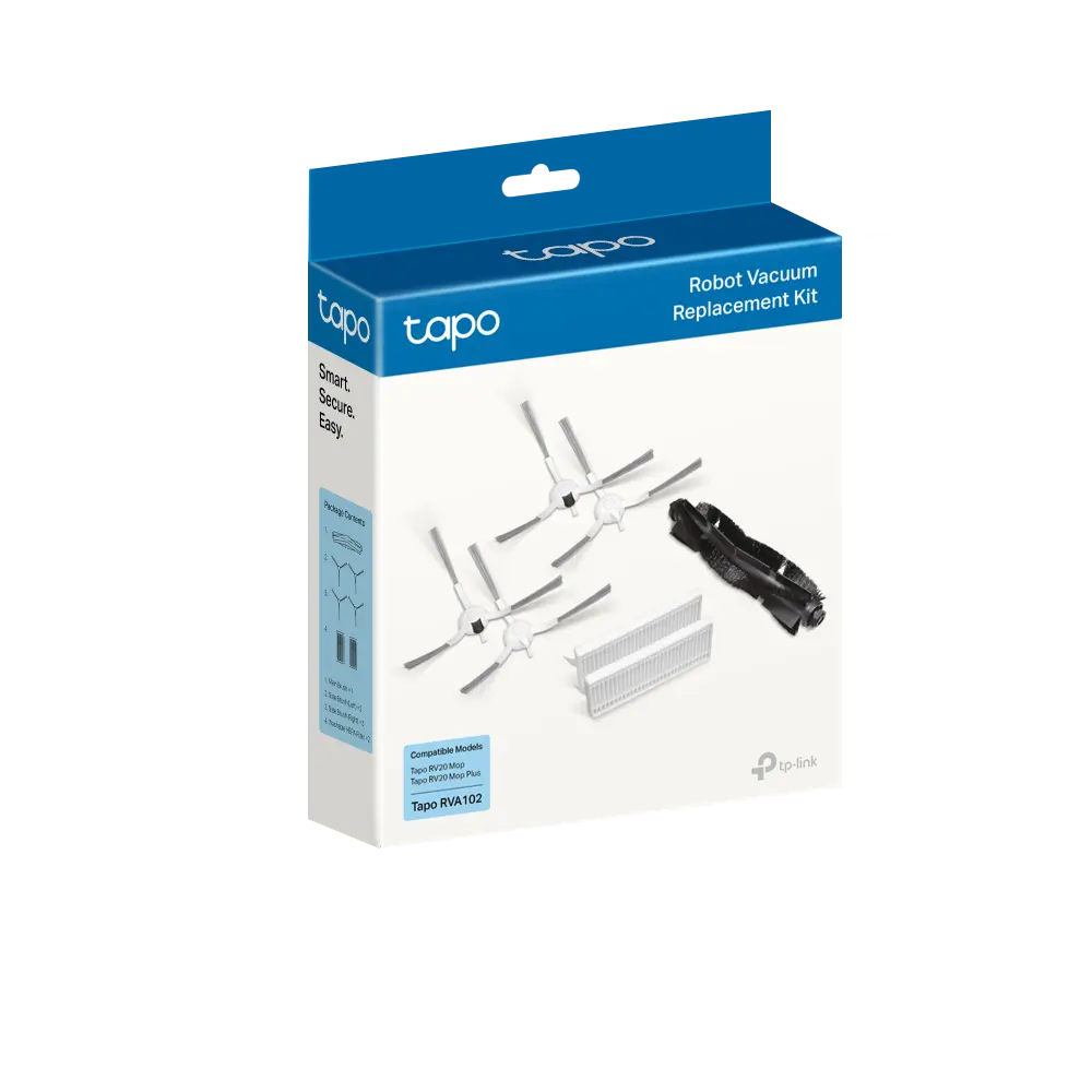 Tapo RVA102 is een vervangingsset voor Tapo robotstofzuigers, met een hoofd-borstel, twee zijborstels en twee HEPA-filters, geschikt voor. de Tapo RV20 Mop.
