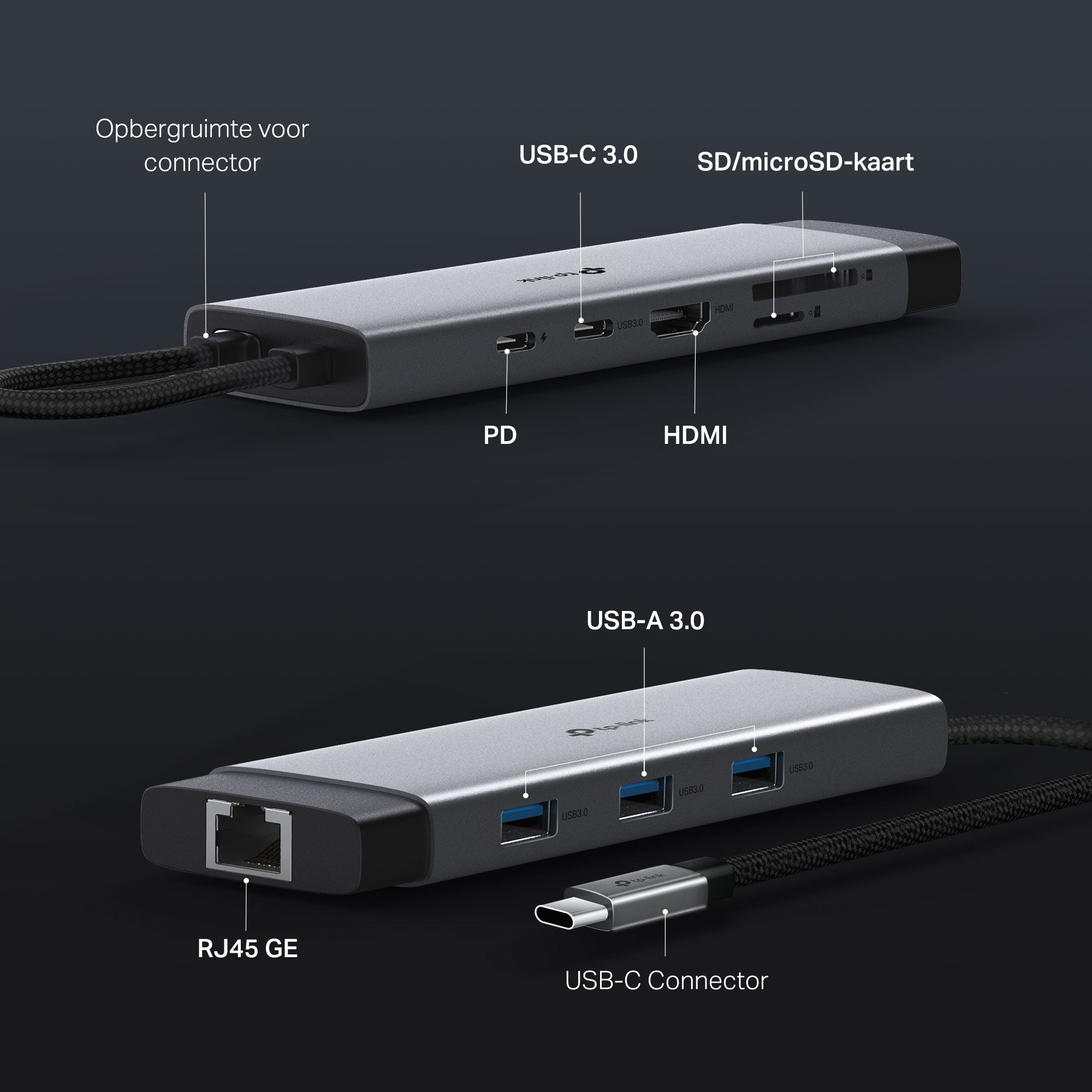 9-in-1 USB-C hub – breidt één USB-C-poort uit naar 9 aansluitingen.
