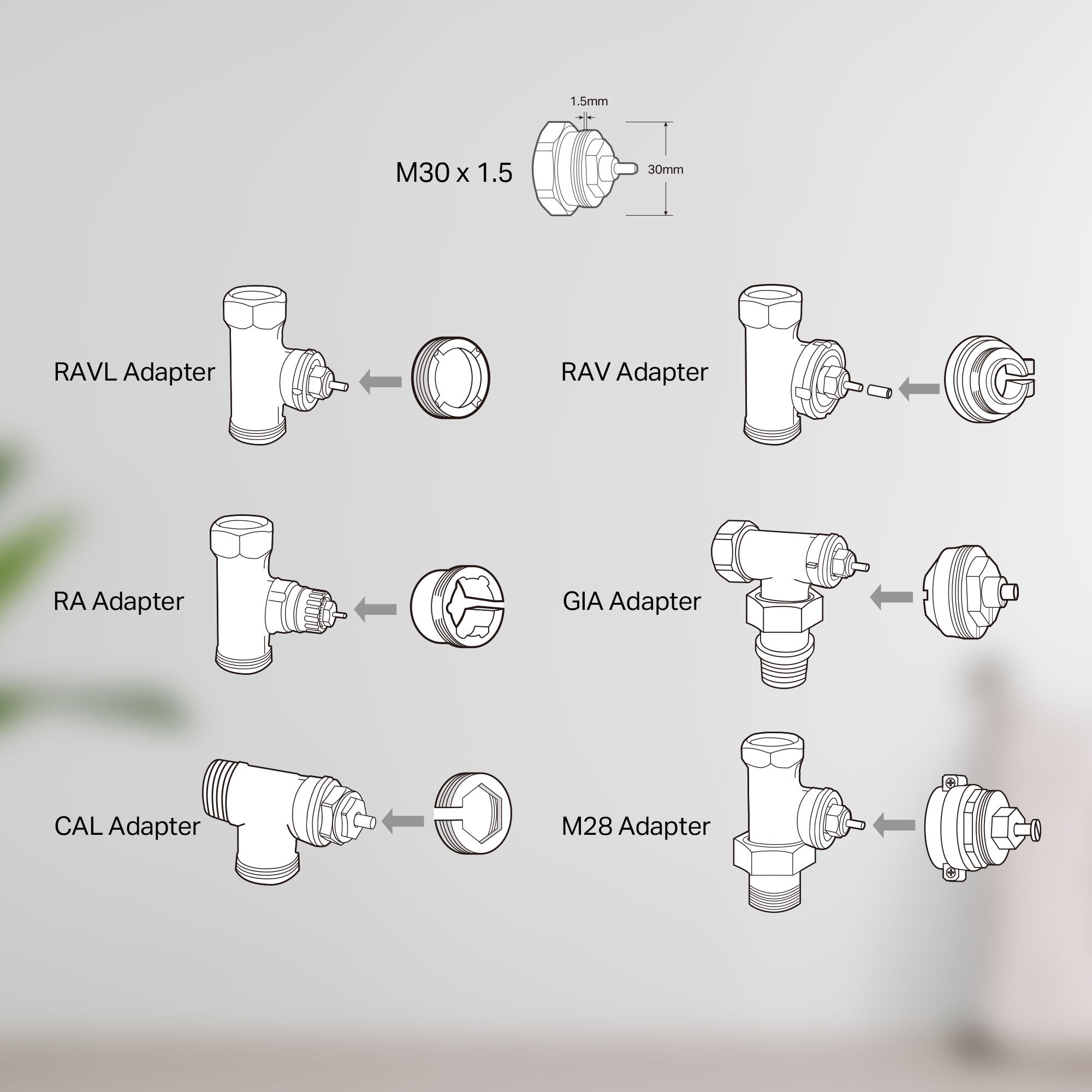Past op de schroefdraden (M30x1.5) van de meeste radiatorkranen. Ook worden er drie adapters meegeleverd.